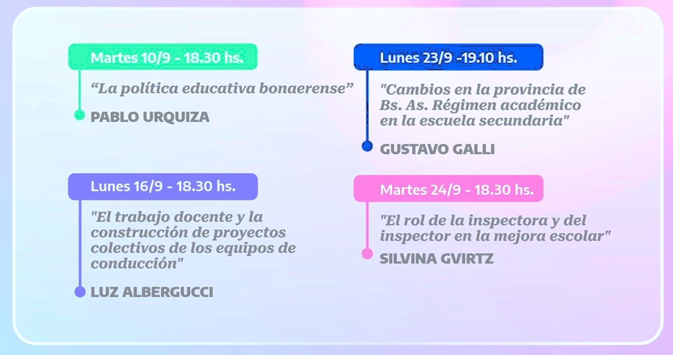 Dirección de Concursos de la Dirección General de Cultura y Educación de la provincia de Buenos Aires. Este programa tiene como objetivo principal fomentar el desarrollo profesional y académico de los docentes a través de una serie de encuentros virtuales con destacados académicos y profesionales de diversas disciplinas.
